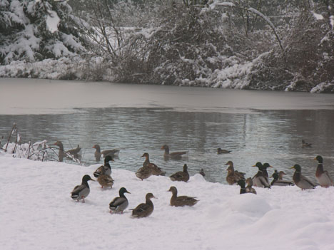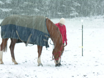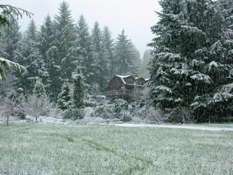 Path through conifers in lower garden in winter. 2nd photo, view through conifer garden towards horse pasture in the spring.