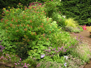 Our sunken garden is a mixture of perennials, evergreen and deciduous shrubs. It is framed with a half circle of sheared Canadian hemlock.