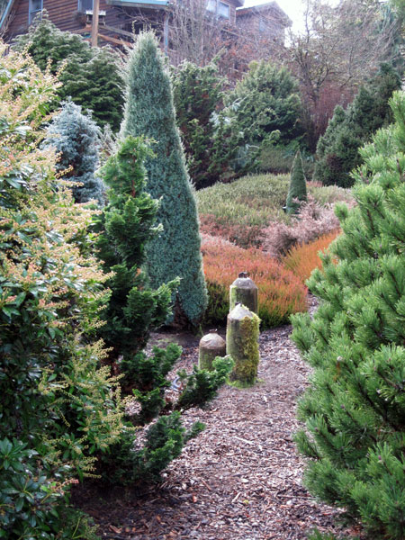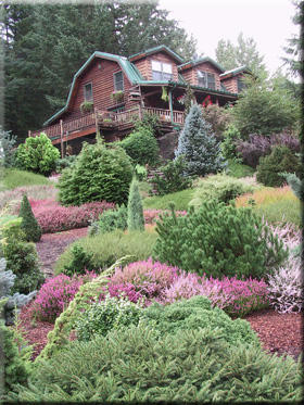 One winter we had "The Siberian Express" blow through our nursery. When all was said and done, we lost about 50,000 potted plants. We dumped them all (amidst tears) over a slope below the house, and Mother Nature created a very nice composted base for the Heather Garden, which was planted five years later. The heathers and heaths flow downwards in large drifts of color and texture, contrasting with the many intermingled dwarf conifers.