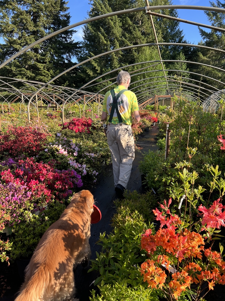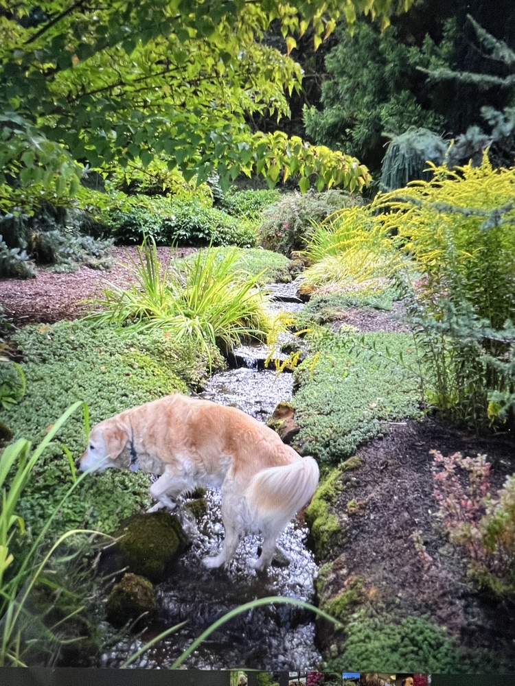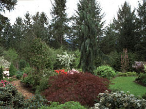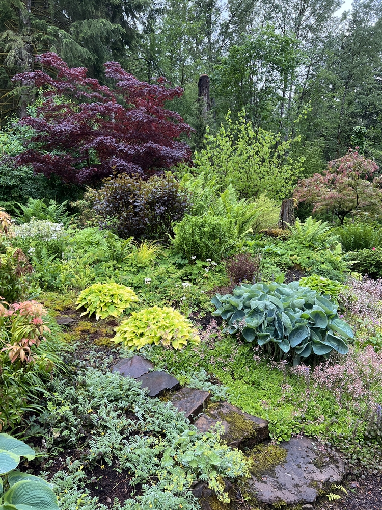 Our garden is framed with a native forest of Douglas Firs, Western Red Cedars and Western Hemlocks. We try to use lots of foliage color and texture to stand out against the natural green background.
