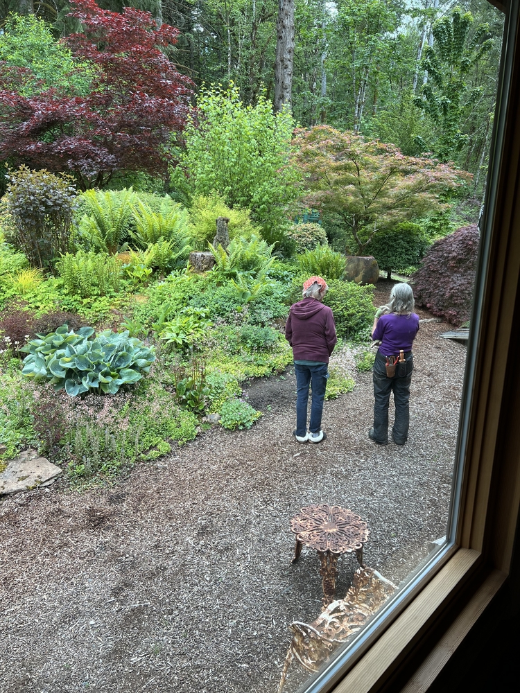 This spot behind the house was the first to be planted. A friend was cleaning out her perennial bed and gave us a truckload of "starts." We planted them with no particular design in mind. Over the years, we have added, deleted, and planted trees and shrubs. Every season this area looks a little bit different. The "ever-changing" garden! 2nd photo Val and Barb planning the day's work schedule.
